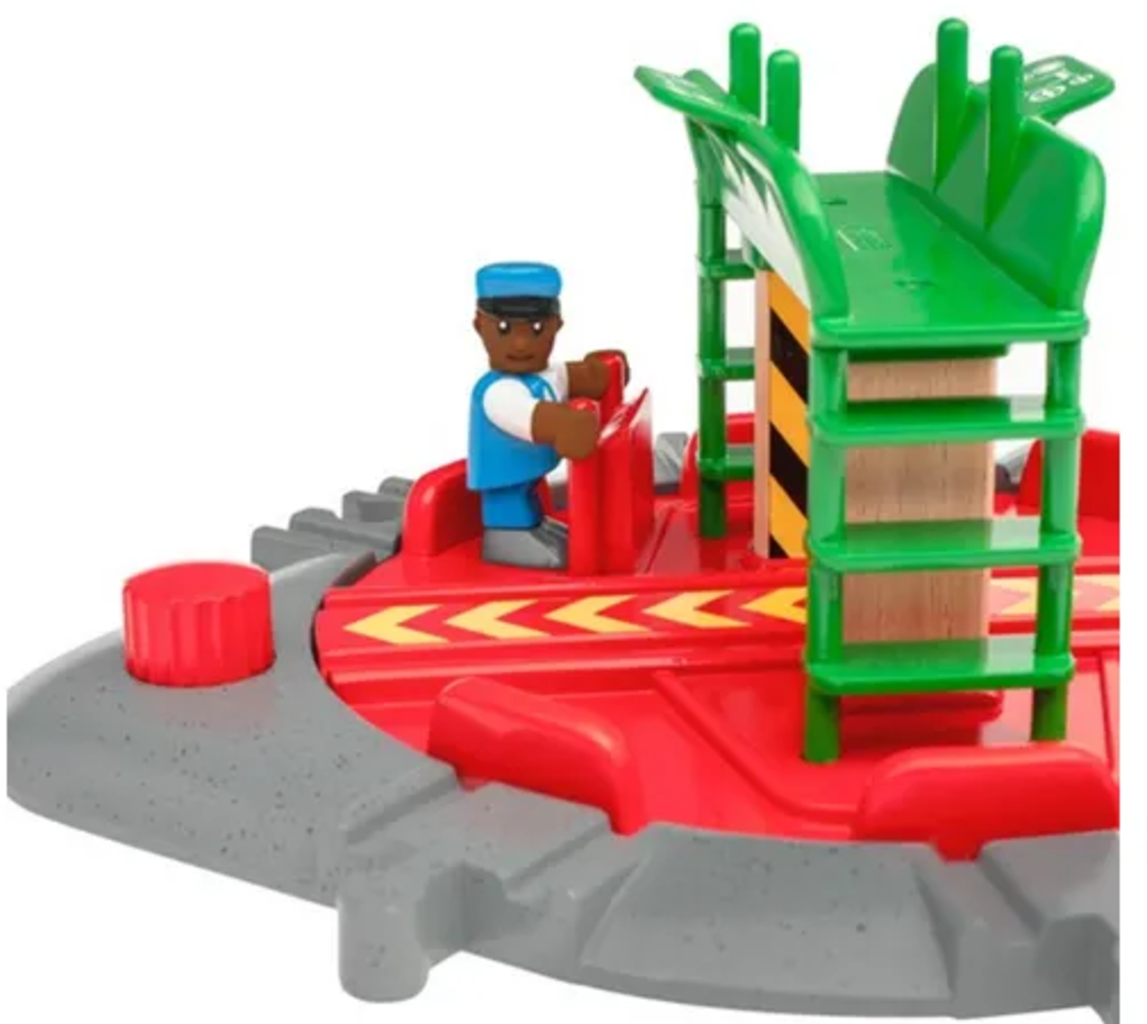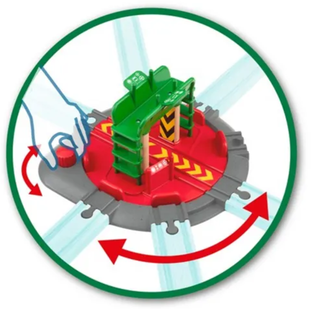 La plaque tournante pour locomotives avec pont de contrôle est le nouveau cœur de votre circuit BRIO. Chaque locomotive a sa place sur la plaque tournante. En tournant le bouton rouge, la plaque se déplace et s'enclenche sur la connexion souhaitée. Sept connexions différentes vous offrent de nombreuses possibilités pour concevoir votre parcours. Depuis le pont de contrôle, les figurines BRIO gardent un œil sur tout.
