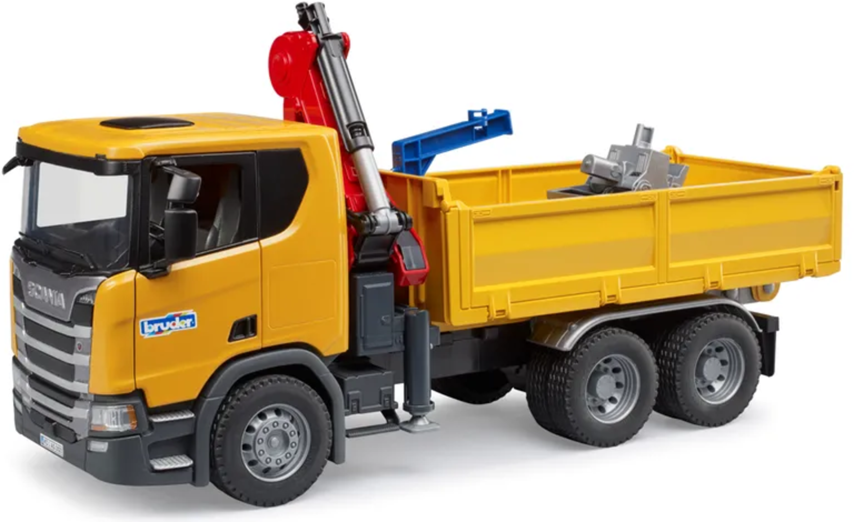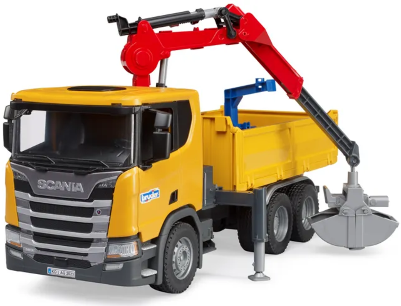 Le Scania Super 560R Camion de chantier est parfait pour charger divers types de marchandises en un rien de temps, les transporter en toute sécurité et les livrer intactes à destination. Ce jouet authentique de BRUDER est livré avec une fourche à palettes et un grappin à godet, qui se fixent au bras de grue pivotant. Celui-ci possède une fonction de verrouillage pratique. Le plateau de chargement est basculant et 3 des ridelles peuvent être rabattues.