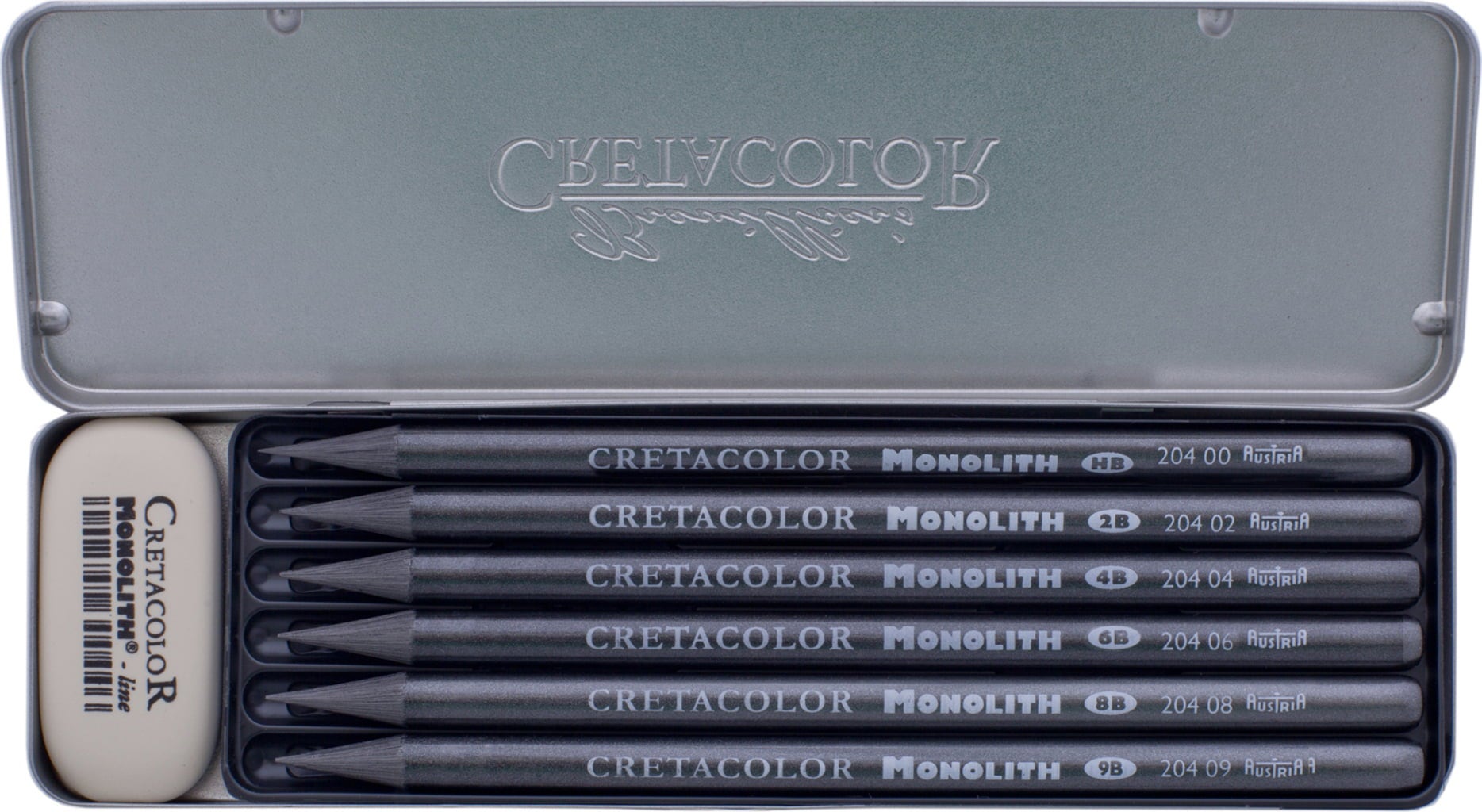 Un excellent cadeau pour vos amis artistes amateurs. Contient 6 crayons Monolith de haute qualité et une gomme Monolith.