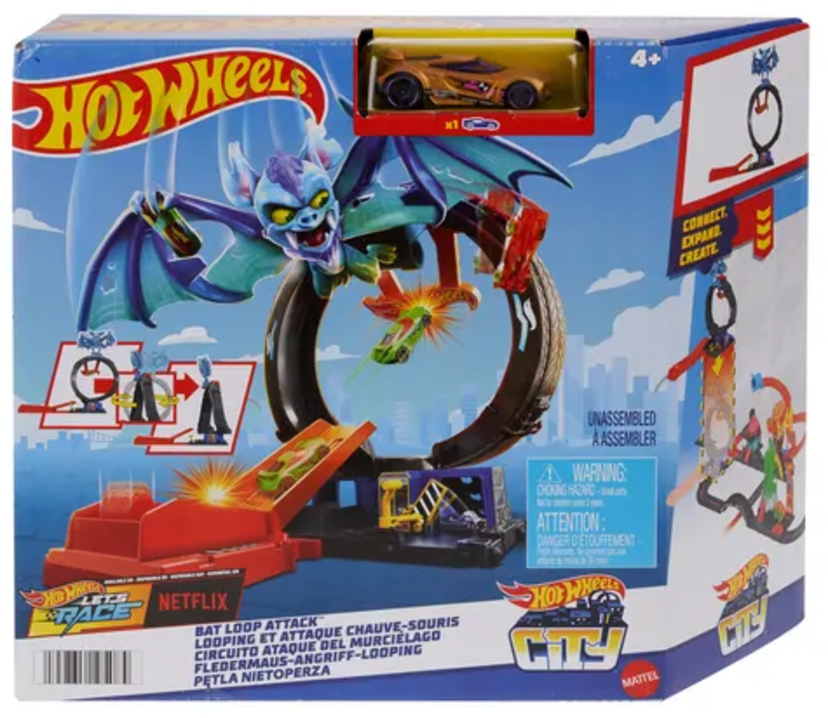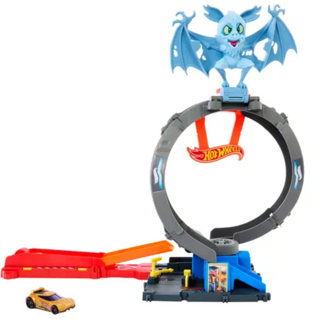 Une effrayante chauve-souris a attaqué la boutique de pneus de Hot Wheels City. Seul un véhicule cascadeur intrépide pourra la faire fuire ! Lancez votre voiture sur la rampe à vive allure pour essayer de la faire tomber, ou bien visez-la directement pour l’atteindre dans un saut spectaculaire ! Sinon vous pouvez tout simplement l'ignorer et filer sous le looping pour poursuivre votre aventure sur une autre piste connectée.