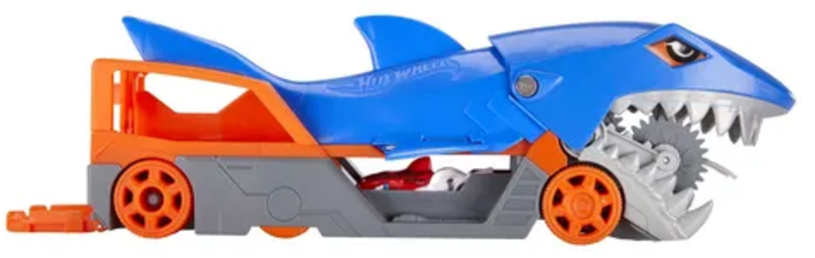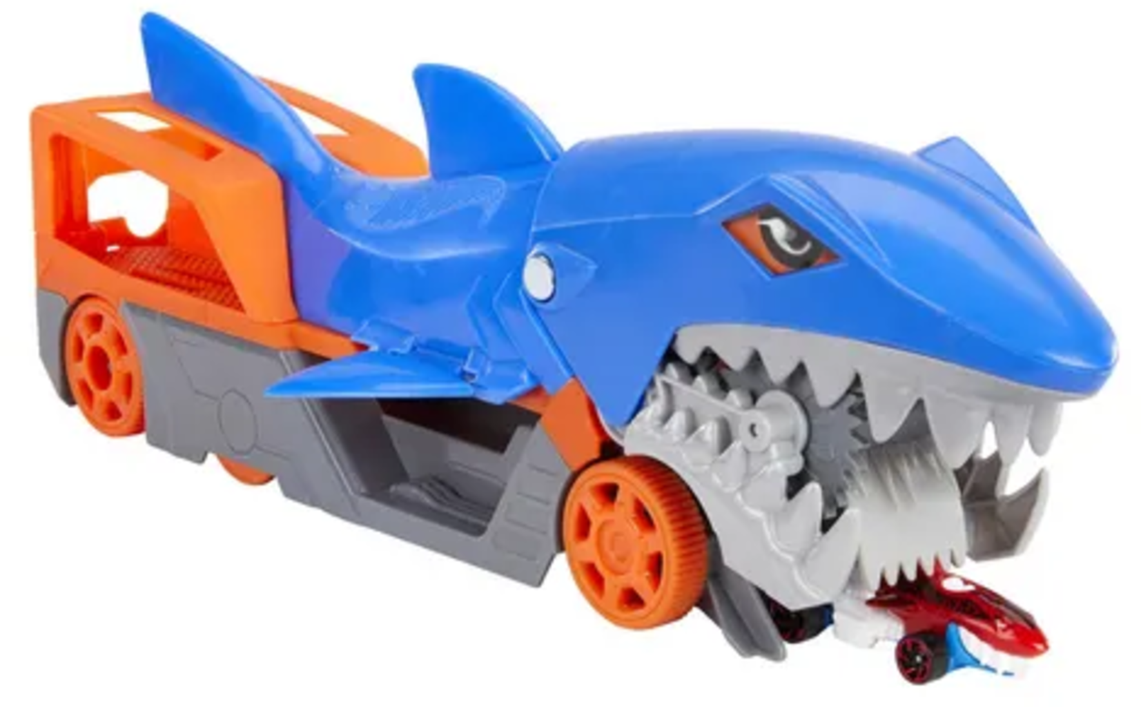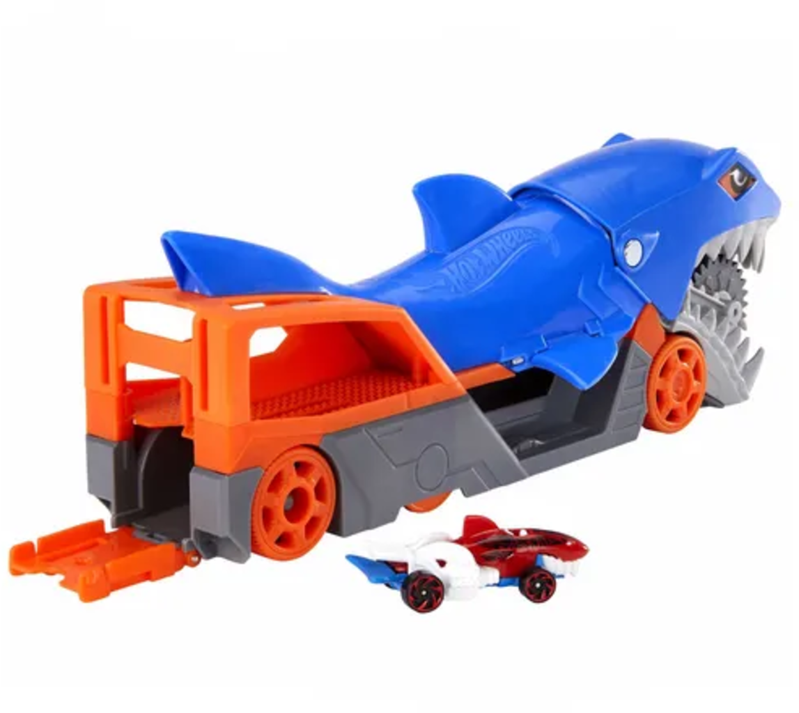 Faites avancer le camion-requin pour ouvrir et refermer sa gueule : s’il croise une voiture, il la dévore et la stocke dans son ventre ! Les véhicules peuvent ensuite sortir à l’arrière par une rampe pratique.
