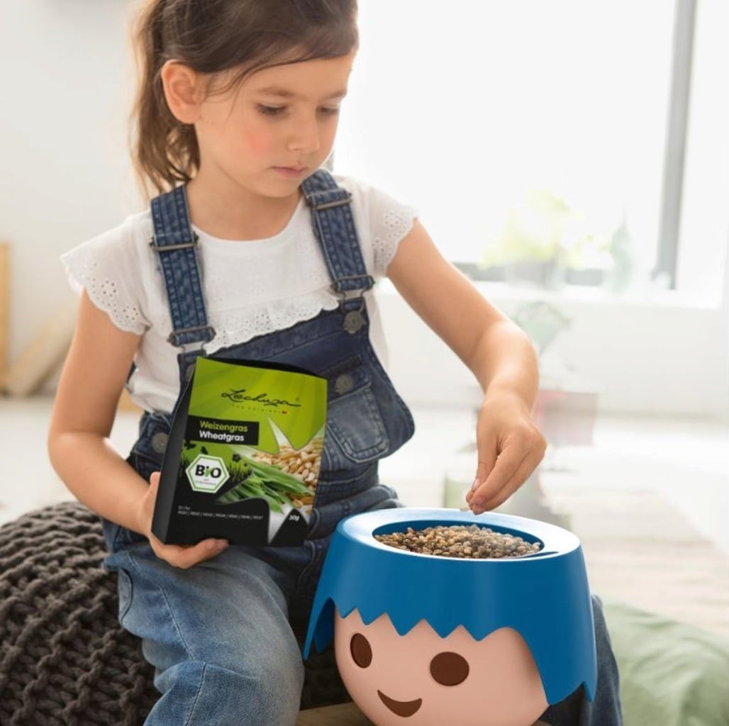 Il existe différentes versions du pot OJO. Choisissez celui que vous préférez, puis il suffit d'insérer directement dans OJO un pot en plastique de fleurs/herbes préalablement acheté, et voilà, votre bonhome PLAYMOBIL a des cheveux !