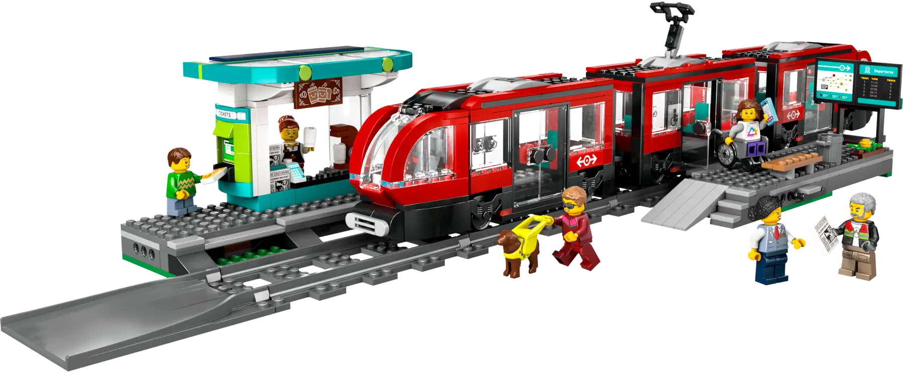 Un tramway, une station et 6 mini-figurines, un chien-guide et un fauteuil roulant.