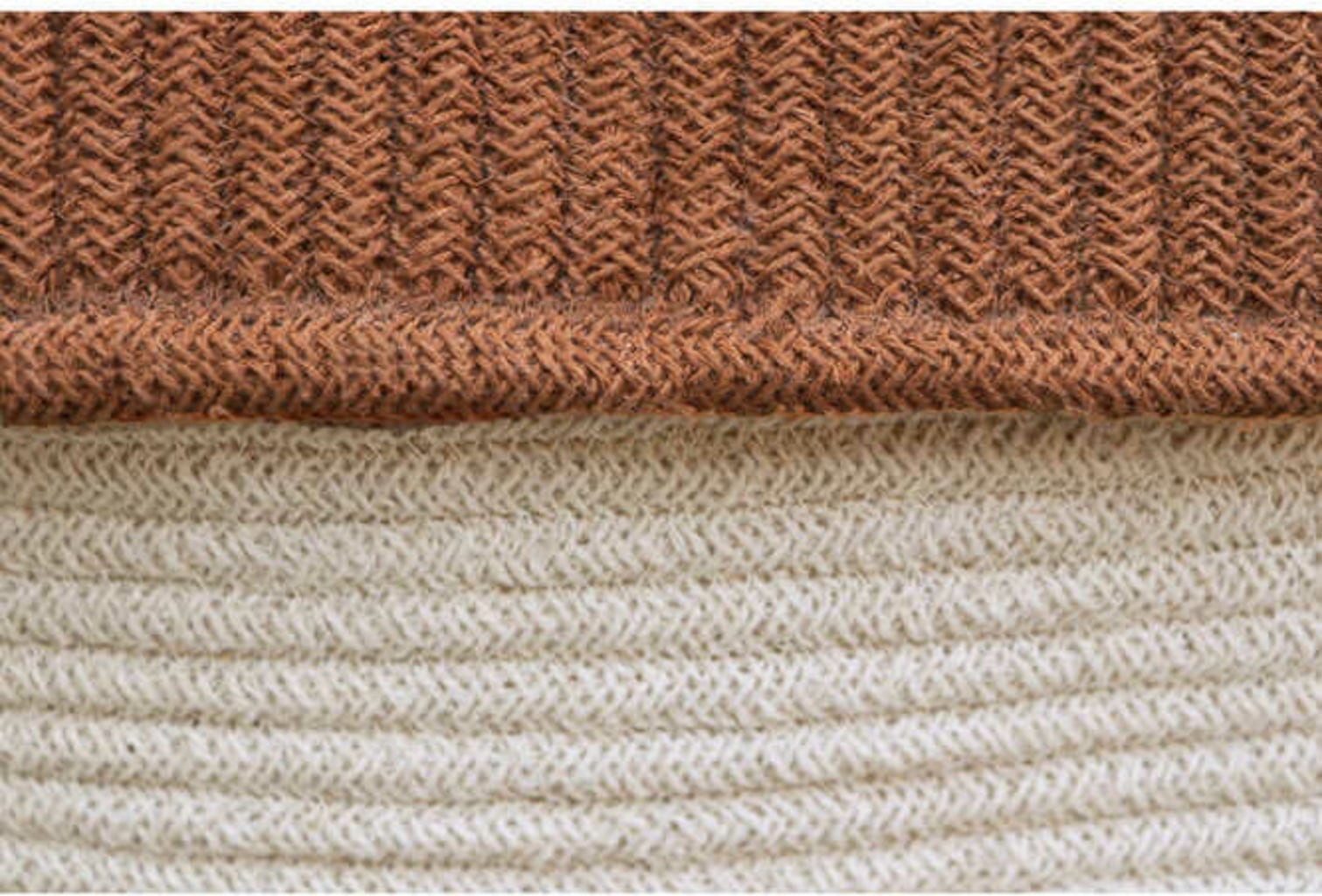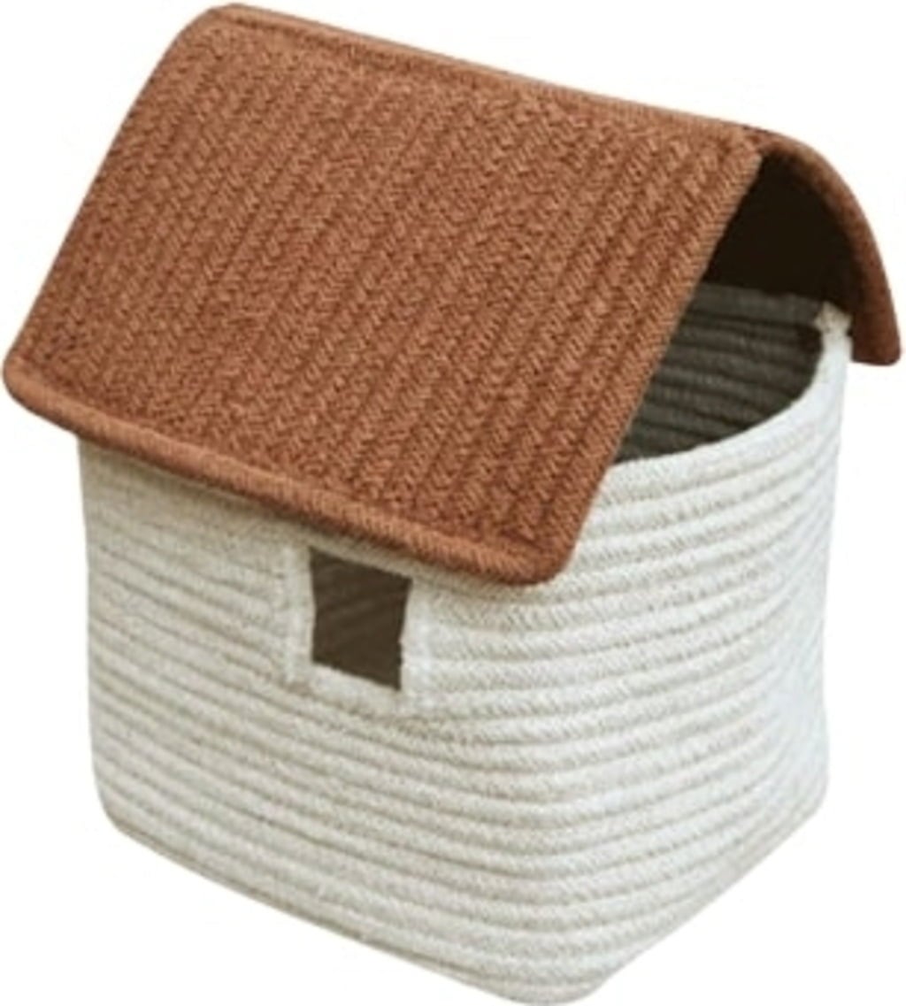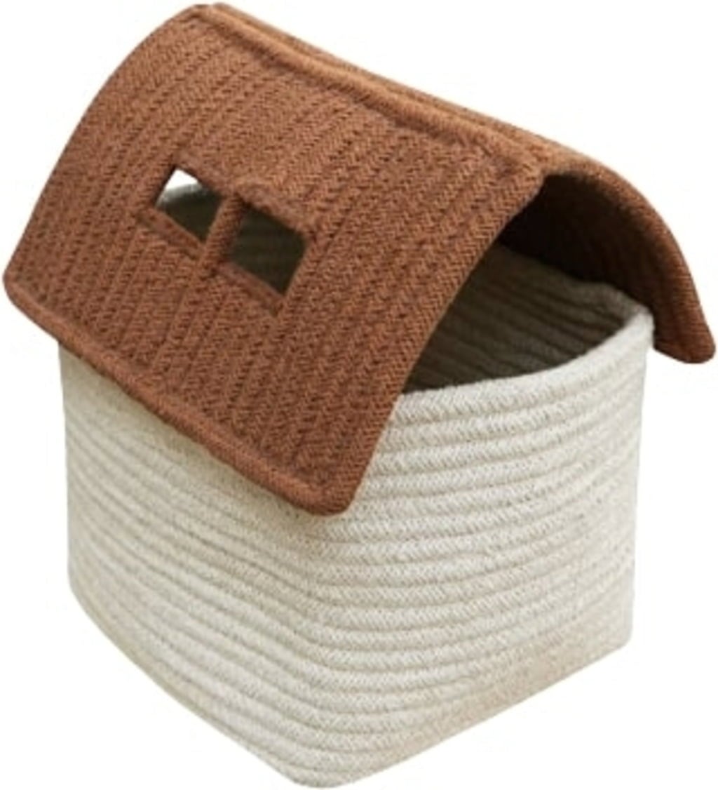 Ils sont faits en cordons de coton épais et tressés qui sont traditionnellement fabriqués à la main. Ces paniers en forme de maison ont petits détails comme des fenêtres et un joli toit à pignon. Seuls des colorants naturels ont été utilisés pour leurs couleurs douces. L'ouverture triangulaire permet de placer des jouets et des souvenirs à l'intérieur du panier où ils seront rangés en toute sécurité.