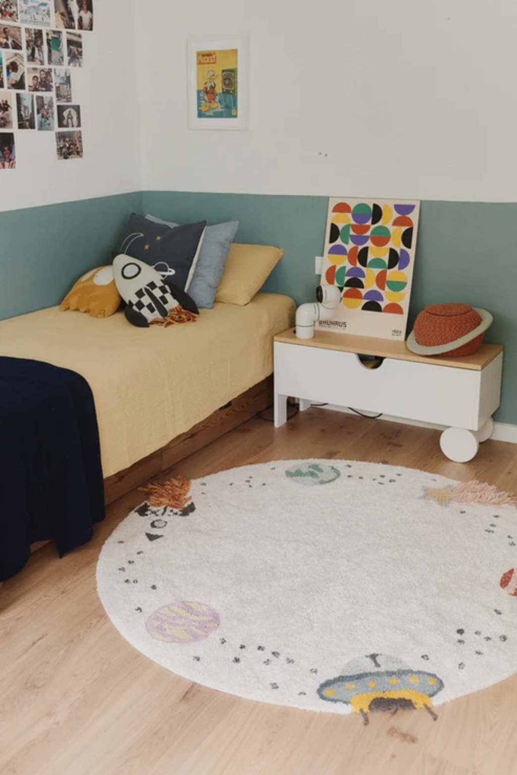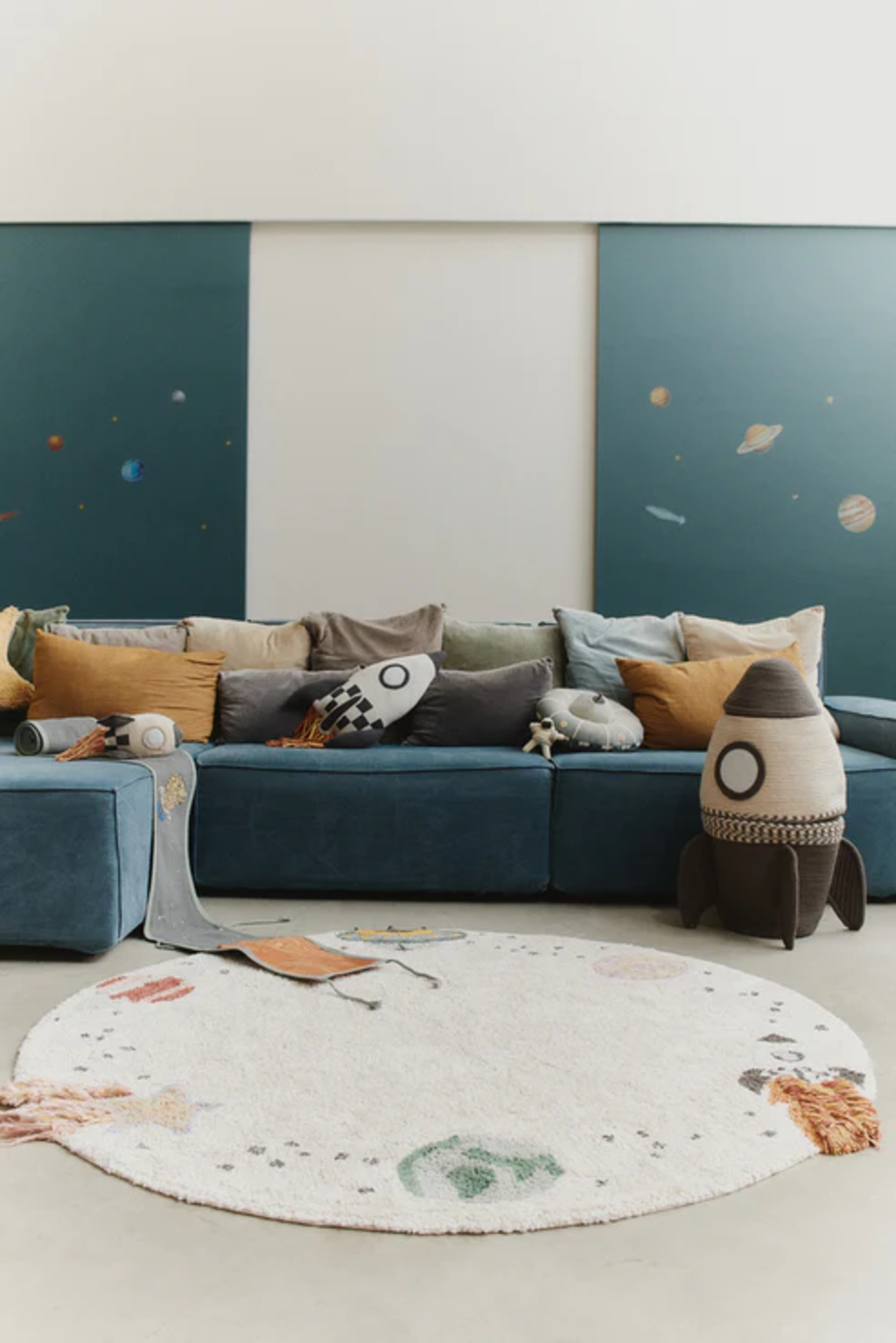 Transformez la chambre de votre enfant en un univers d’aventures galactiques avec ce tapis rond en coton fabriqué à la main. Son design détaillé représente trois planètes, une fusée, une étoile filante et un OVNI : parfait pour les petits explorateurs et futurs astronautes !