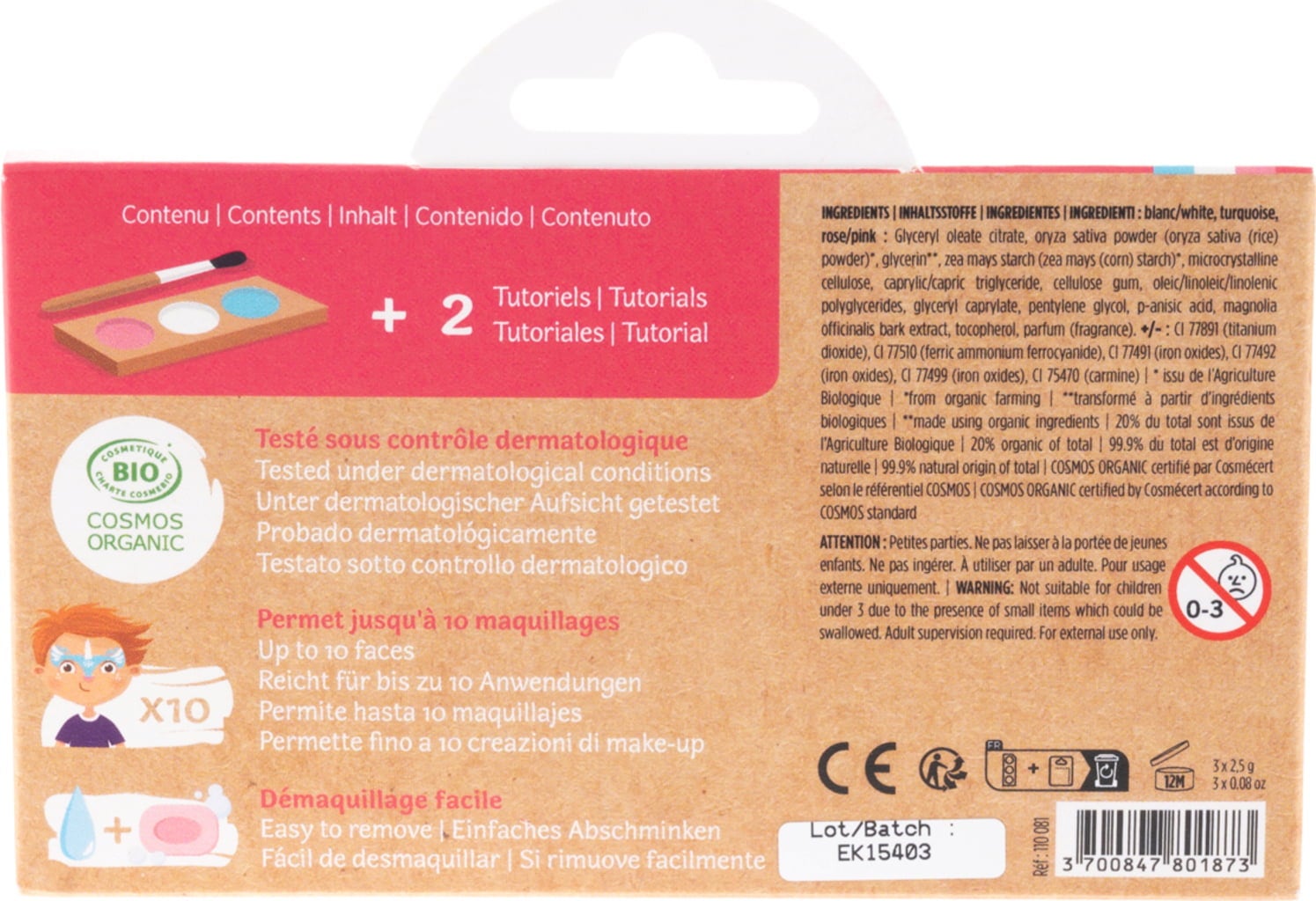 - 3 fards de couleurs disposés sur une palette carton (blanc, turquoise, rose)