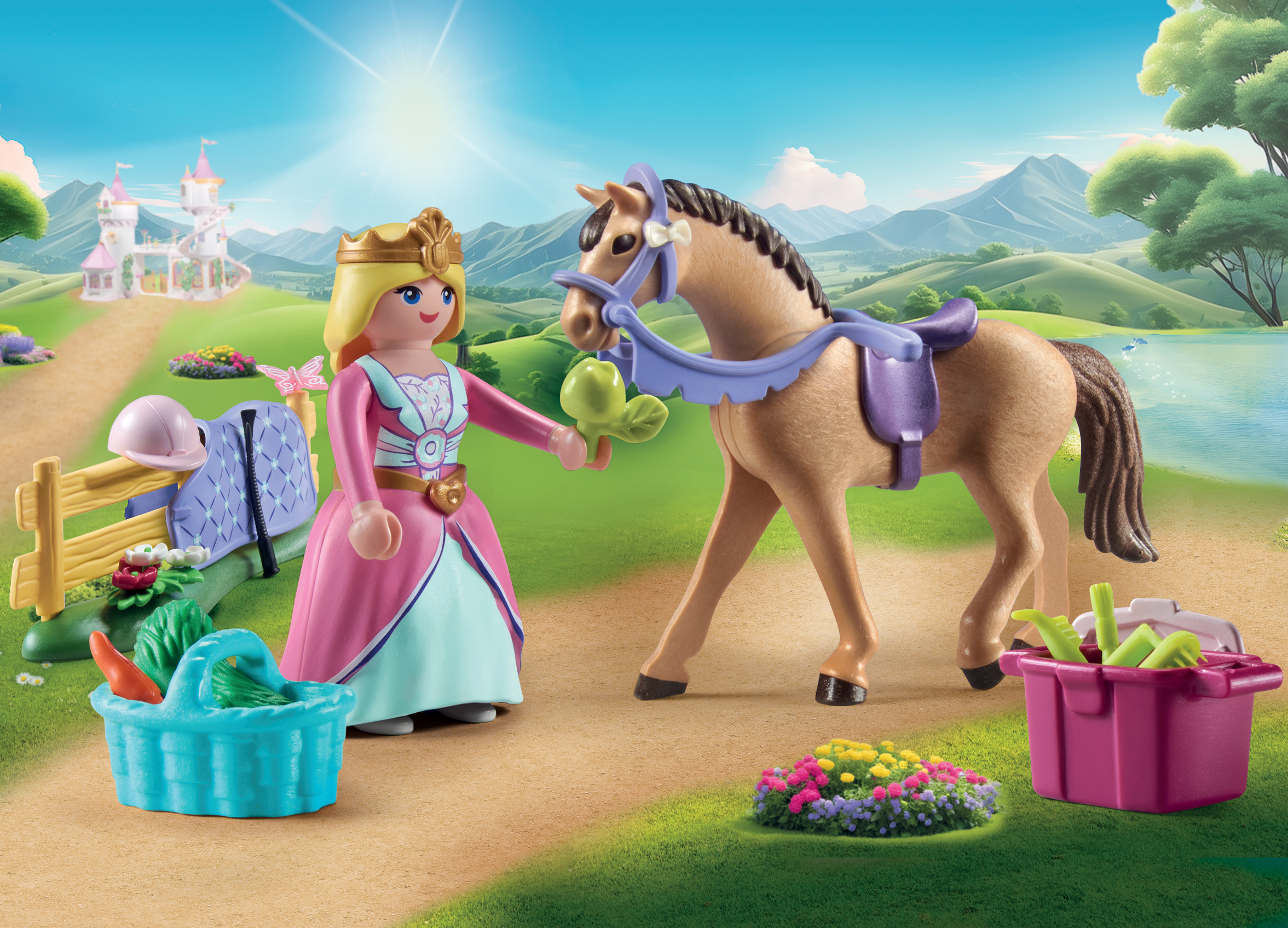 - Accessoires : 1 licol avec corde, 1 selle, 2 éléments décoratifs avec nœud, 2 éléments décoratifs avec étoile, couverture de selle, 1 couronne, 1 jupe, 1 épingle à cœur, 1 casque d'équitation, 2 gants, 1 boîte avec couvercle, 1 panier, 1 pomme, 1 carotte, 1 botte de foin, 1 espace vert avec clôture, 1 plante avec 4 fleurs, 1 cravache, 6 accessoires de pansage