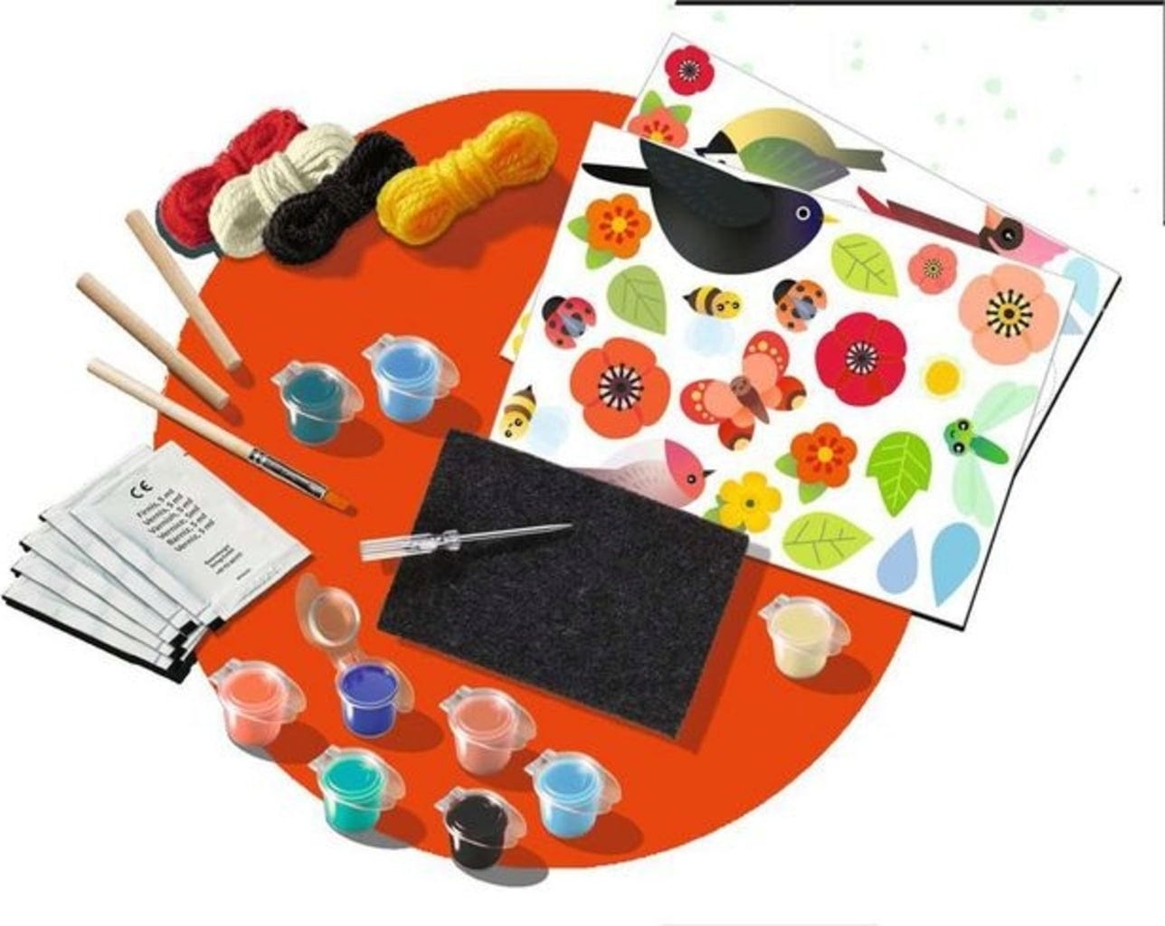 Contenu : Instructions, feuille à découper, aiguille à piquer, tapis de piquetage, bâtons en bois, godets de peinture, pinceau, laine, vernis