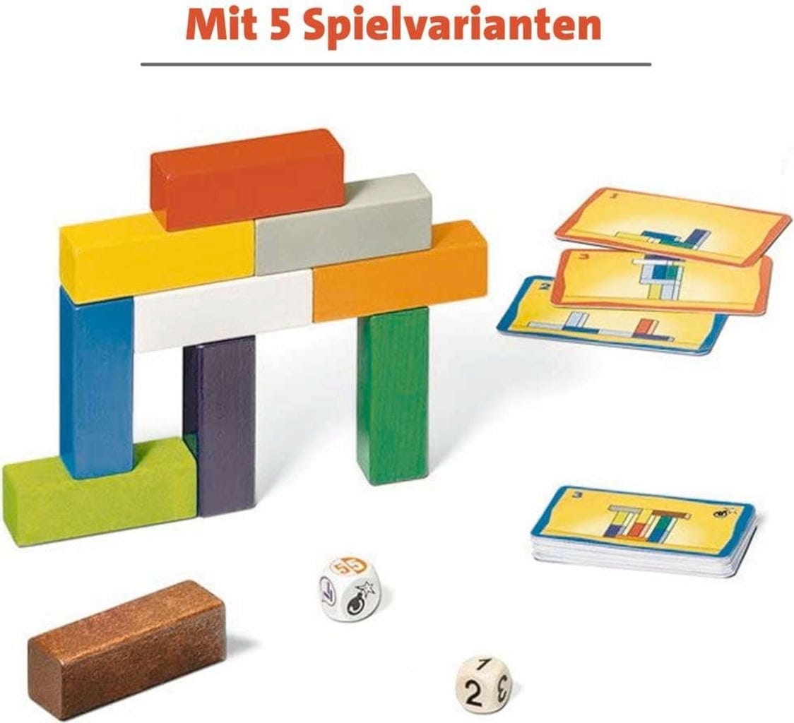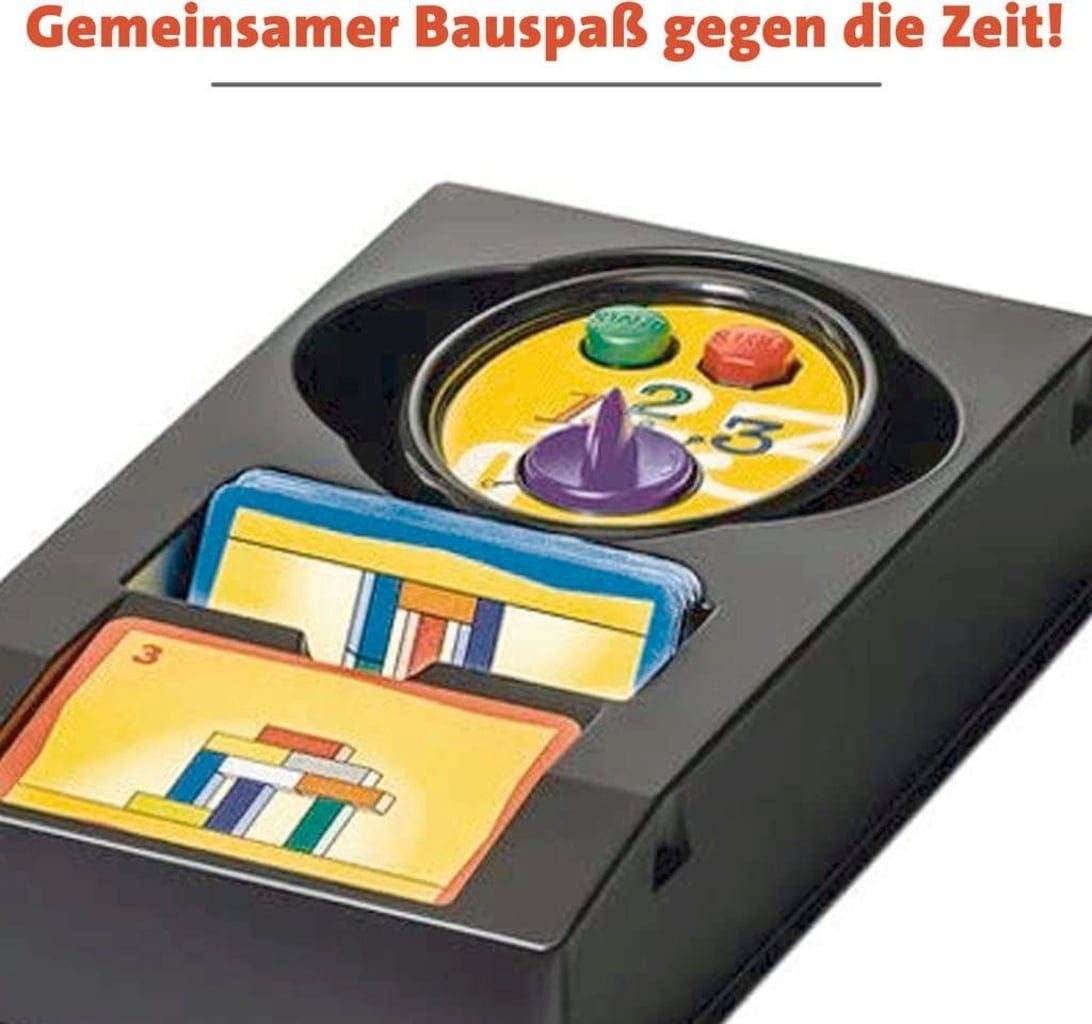 Contenu : 1 support de cartes, 1 minuteur, 80 cartes de construction recto-verso, 10 blocs de construction en bois, 2 dés