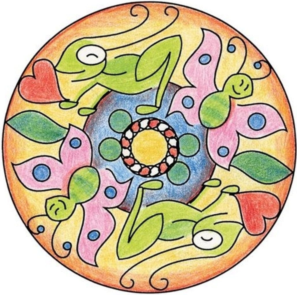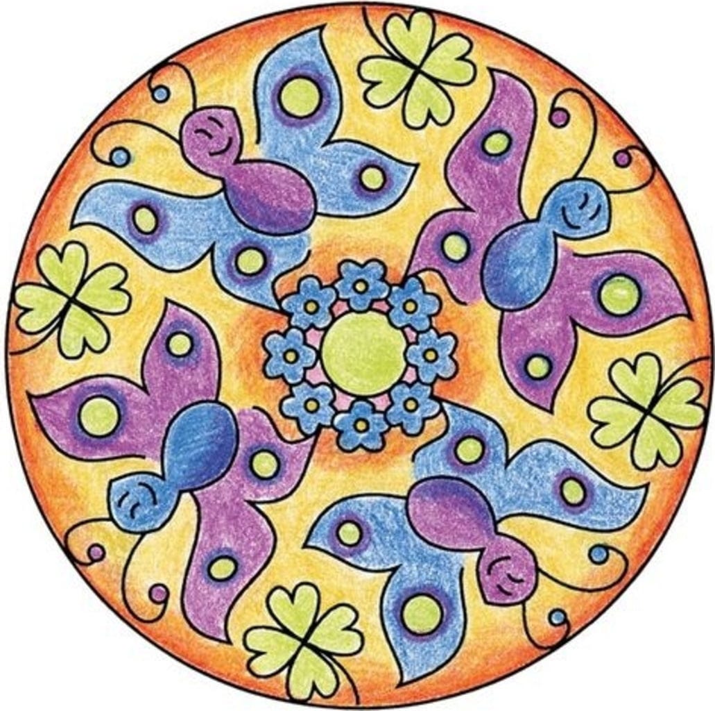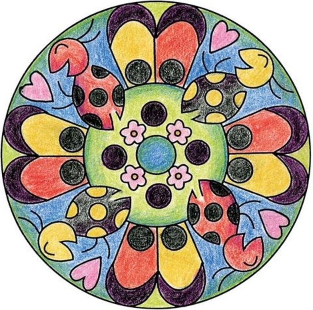Contenu : cadre pour mandala, pochoir, 10 feuilles de papier, feutre, 3 crayons de couleur