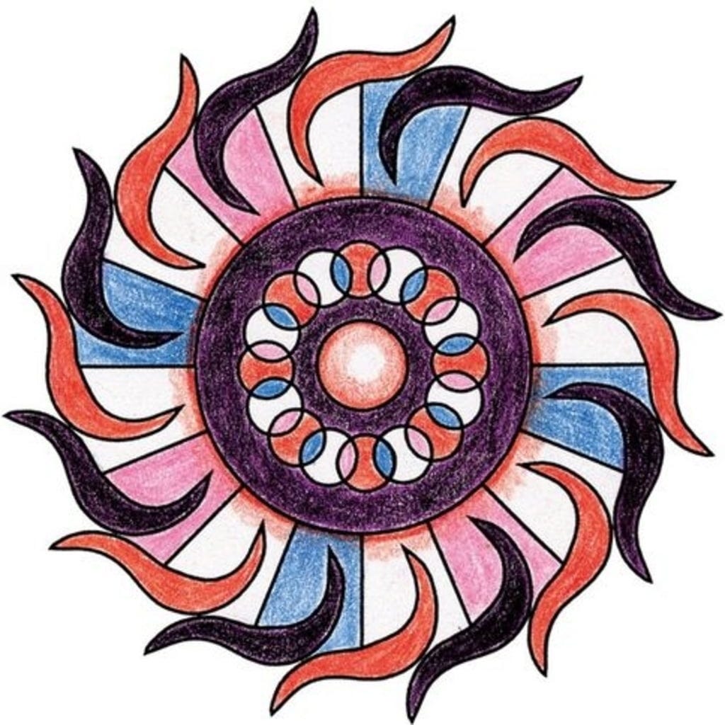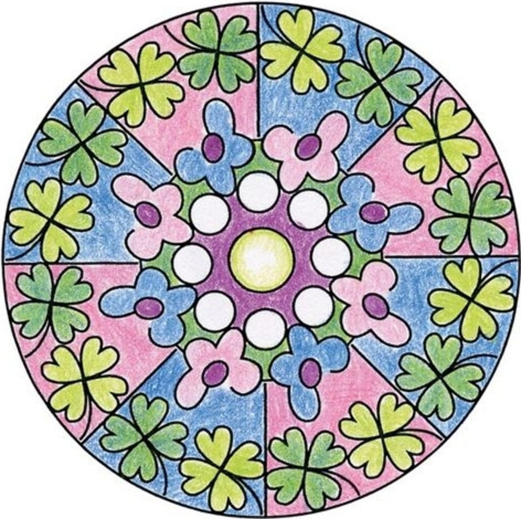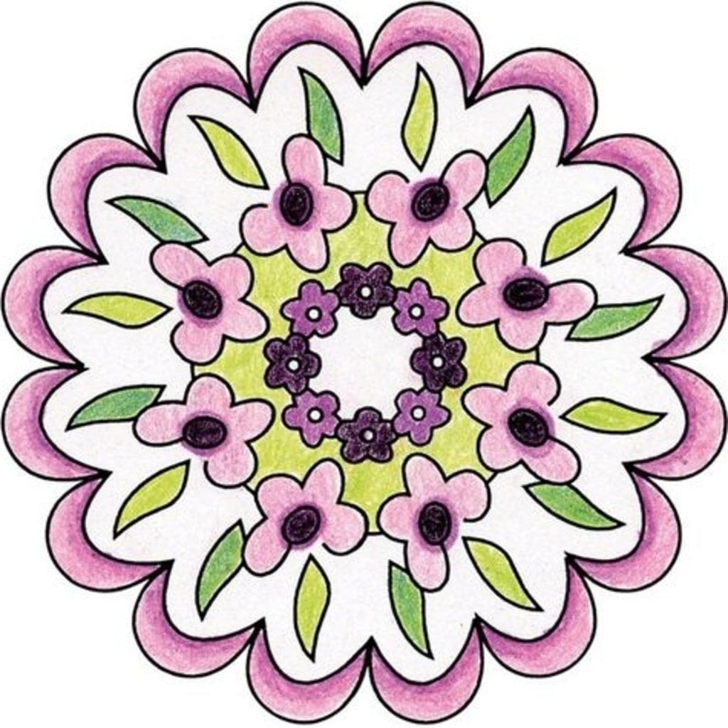Contenu : cadre pour mandala, pochoir, 10 feuilles de papier, feutre, 3 crayons de couleur