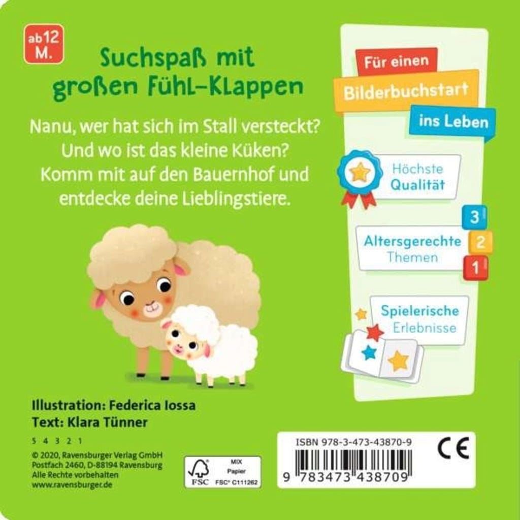 En feuilletant ce livre d'images joliment conçu, des jeux amusants de questions-réponses se développent, favorisant le développement du langage du tout-petit. Les rabats à toucher sont robustes et résistent même aux prises plus fermes. Le livre lui-même se distingue par sa taille compacte et peut ainsi être facilement tenu par de petites mains d'enfants.