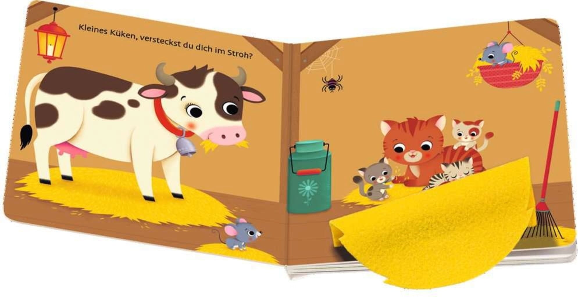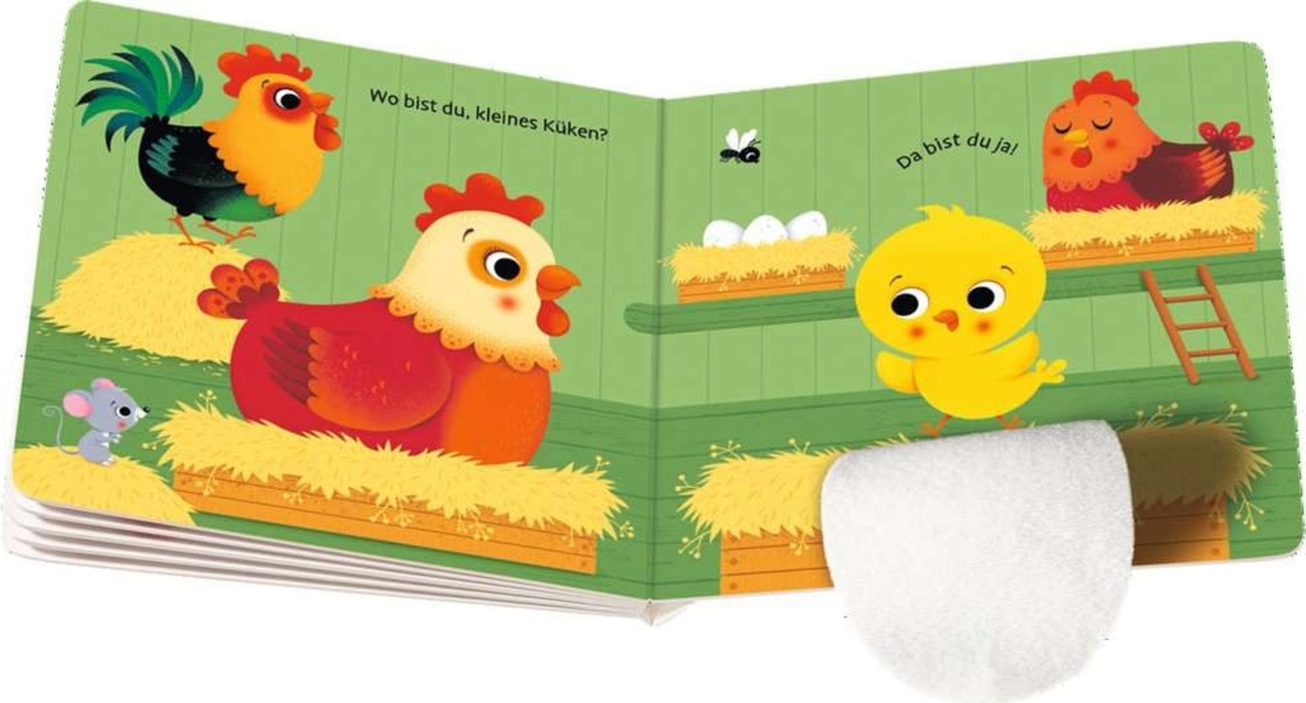 Où le petit poussin s'est-il caché ? Peut-être joue-t-il avec le petit cochon dans la boue ? Ou s'est-il couché dans la niche du chien pour dormir ? Ce n'est qu'en ouvrant les rabats en tissu que les enfants de 12 mois et plus obtiennent des indices sur l'endroit où se trouve le poussin.