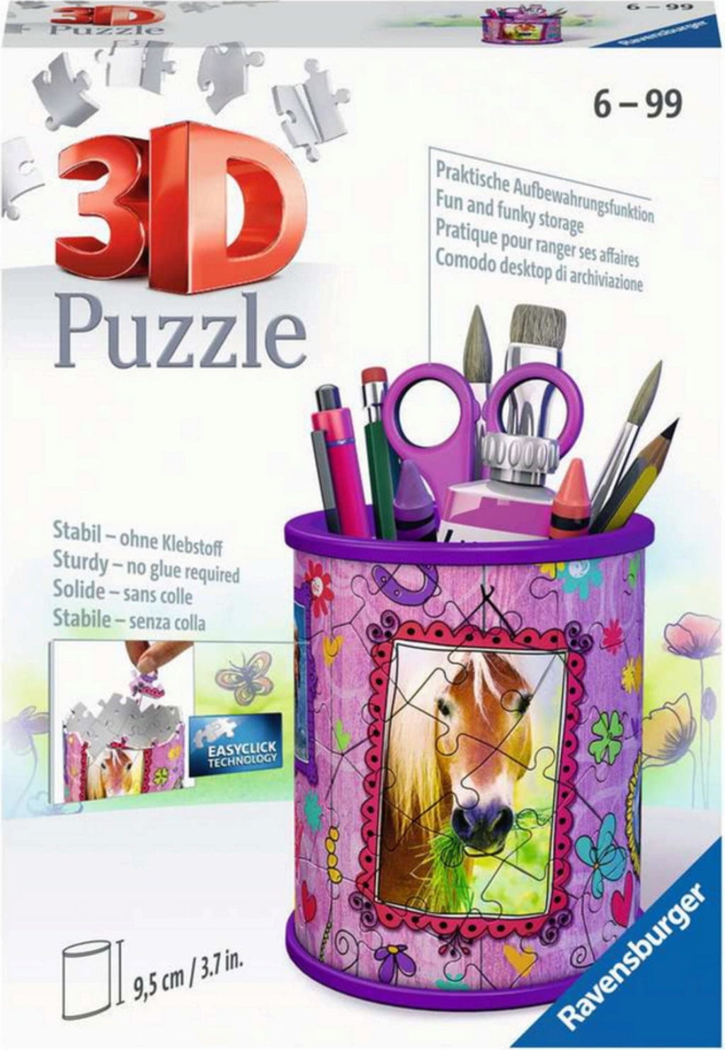 Un plaisir de puzzle passionnant en trois dimensions. Avec ce superbe ensemble, les fans de puzzles peuvent créer un magnifique porte-crayons sans utiliser de colle, qui sera un véritable accroche-regard dans chaque chambre d'enfant. Que ce soit pour ranger des stylos, des bijoux ou d'autres petits objets, le motif de chevaux très tendance apportera toujours de la bonne humeur, partout et à tout moment.