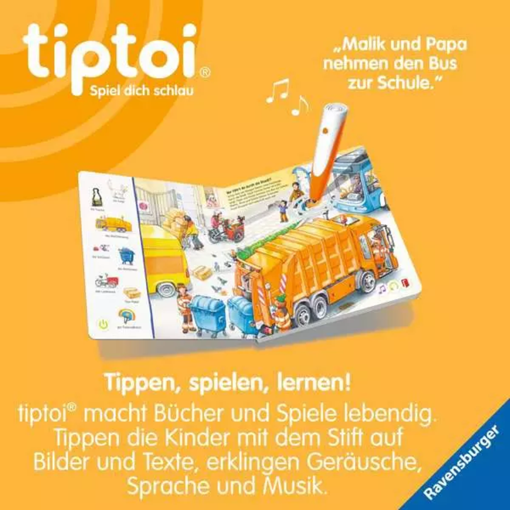 La voiture klaxonne au feu rouge, le camion poubelle gronde dans la ruelle et la pelleteuse vrombit sur le chantier. Les véhicules exercent une fascination particulière sur les enfants. Ici, votre petit trésor découvrira des scènes passionnantes, des sons authentiques et des images à chercher amusantes.