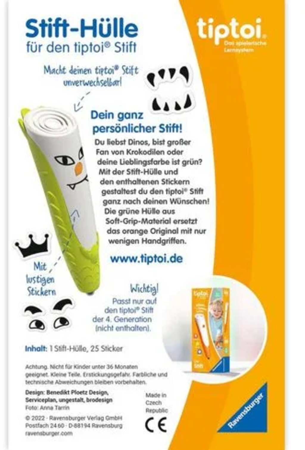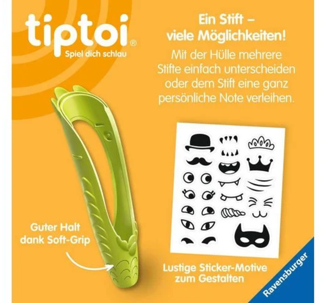 Donnez à votre stylo TIPTOI de 4ème génération un design unique et tout nouveau. Avec l'étui vert et les nombreux autocollants, les possibilités de personnalisation sont infinies. Il suffit de les coller et de commencer à jouer. Grâce à sa prise en main douce, votre stylo tient particulièrement bien dans la main.