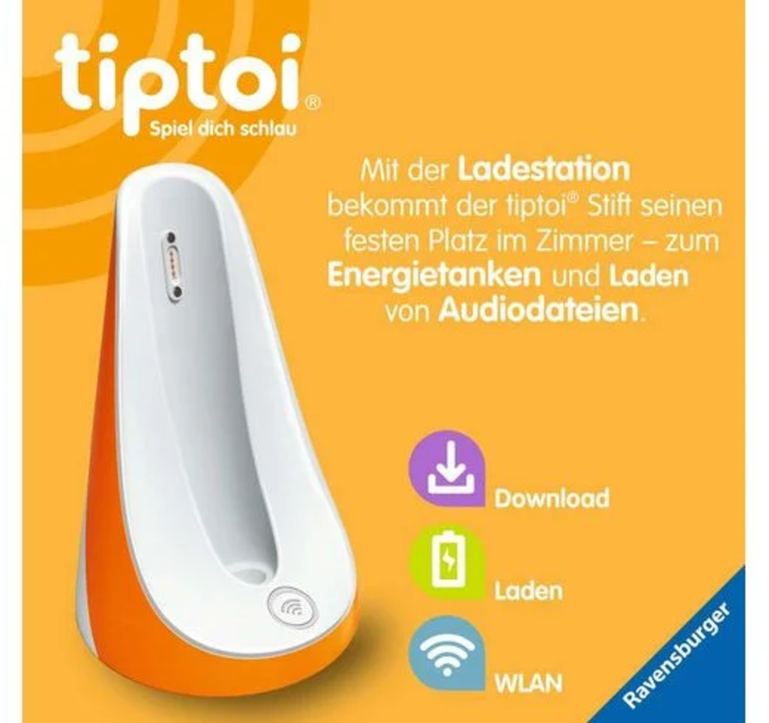 Cette station de recharge est adaptée au stylo de 4ème génération. Pendant que la batterie se charge, les fichiers audio pour les livres tiptoi peuvent être téléchargés automatiquement via le Wi-Fi. De plus, elle met fin à la recherche constante du stylo, car celui-ci a désormais un emplacement fixe.