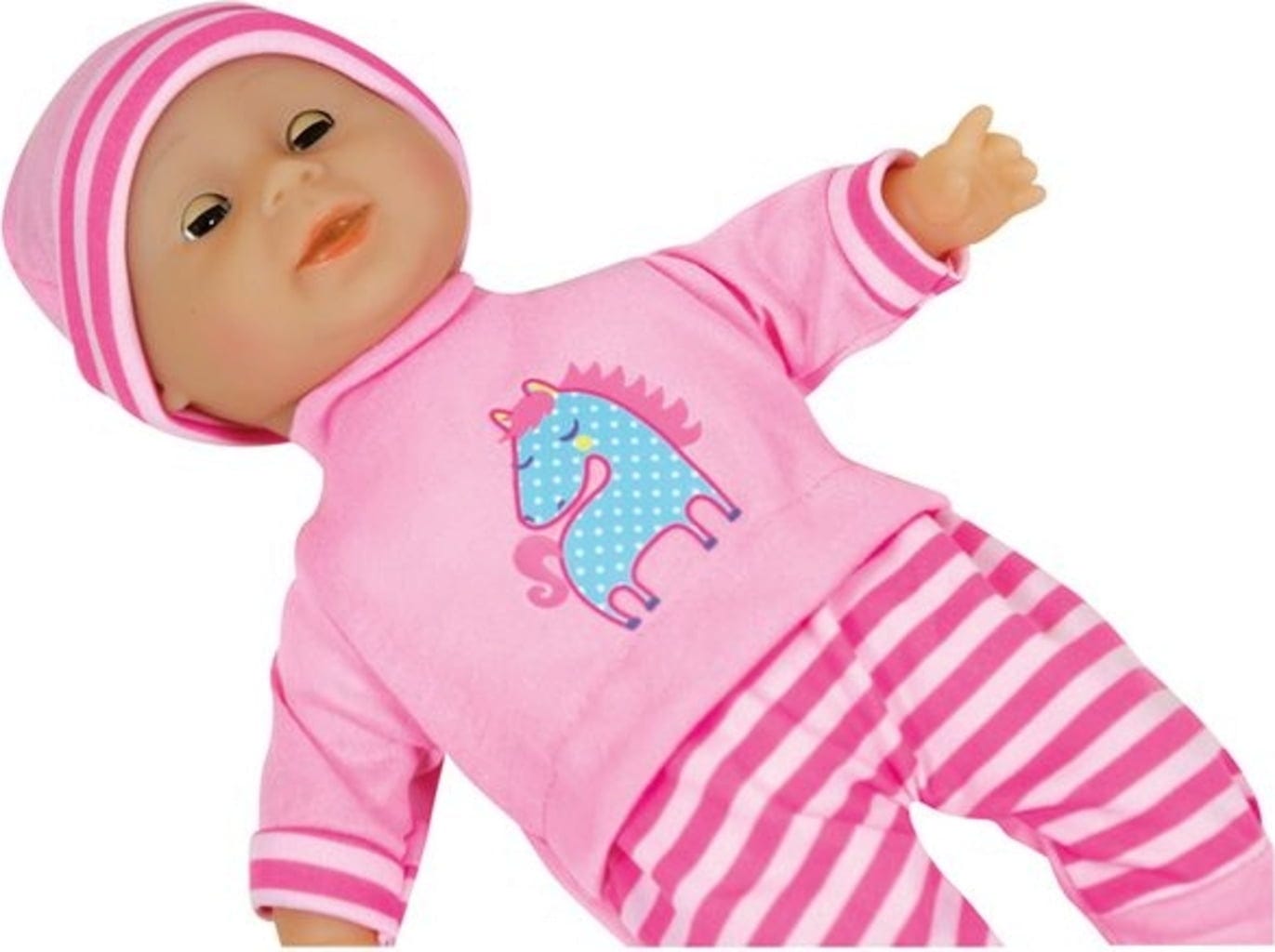 Je suis fatigué, je vais me reposer et fermer mes yeux. Mais quand je serai réveillé, je voudrai te faire des câlins ! Une poupée au rembourrage doux avec une grenouillère rose et un bonnet. Quand tu la couches, elle ferme les yeux pour dormir.